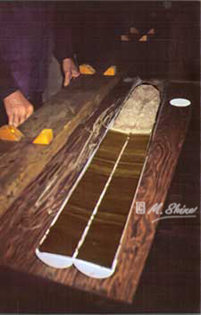 The great depths of Loch Ness provide an especially stable resting place for the rain of particles from above. In shallower lakes, the silt can be re-suspended by water currents thus blurring the sequences but in Loch Ness the sediments build an undisturbed time capsule of events within the lake, the surrounding catchment and much further afield. Studies of cores recovered by the Loch Ness Project's ROSETTA corer have provided a variety of information. Adrian Shine designed the ROSETTA project in order to operate a long core barrel at a depth of 230m. He hoped to retrieve a 12m core that would retrieve thousands of years of sediment and hopefully, reveal glacial clay at the base. It's necessary to raise the rig as quickly as possible in order not to leak any sediment out of the core barrel. So next came the tricky job of forcing compressed air into the anchor chanbers in order to bring everything back to the surface. It was with some relief that we saw the red and white anchore chambers bob to the surface and we began the long haul back to base. The project took 24 hours to complete and it wasn't until the extrusion that the team could be sure of their success.
